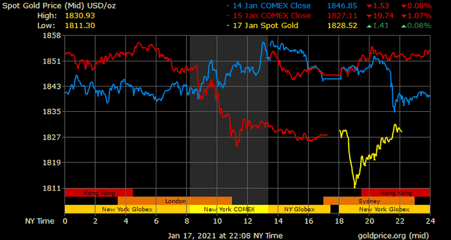 Trên thị trường vàng thế giới, giá vàng giao ngay chốt phiên cuối tuần tại Mỹ giảm 18 USD xuống 1.828,6 USD/ounce. Sang phiên châu Á sáng nay, giá vàng lao dốc xuống gần 1.810 USD/ounce, nhưng cũng nhanh chóng bật trở lại vùng 1.830 USD/ounce.