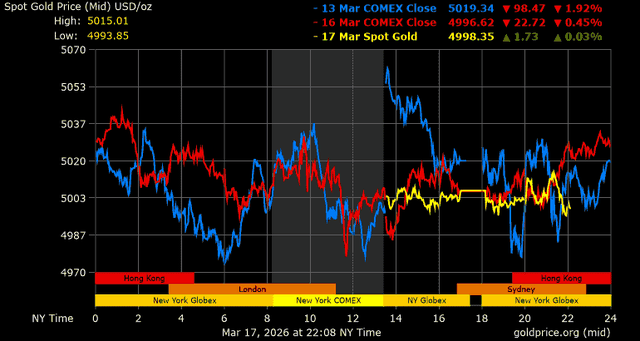 Giá vàng tiếp tục giao dịch quanh mức 5.000 USD/ounce và gặp khó khăn trong việc thu hút lực tăng giá mới do cuộc chiến giữa Mỹ và Israel chống lại Iran hỗ trợ đồng đô la Mỹ, xuất phát từ nỗi lo ngại về thanh khoản trên thị trường tài chính toàn cầu.
