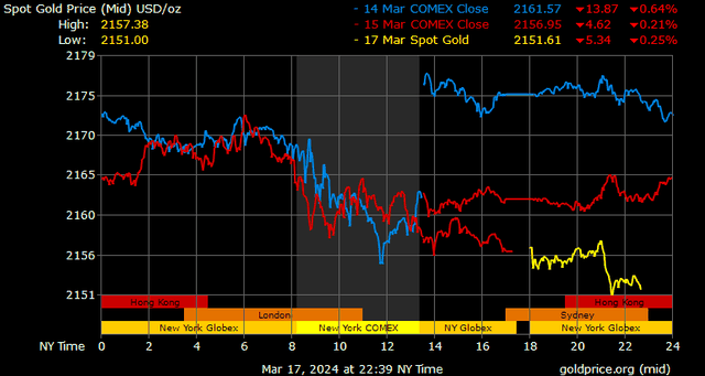 Giá vàng tương lai giao tháng 4/2024 trên sàn Comex New York giảm 6 USD, tương ứng giảm 0,28% xuống mức 2.161,5 USD/ounce.