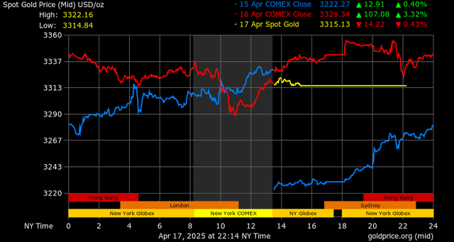 Giá vàng tương lai giao tháng 6/2025 trên sàn Comex New York giảm 18 USD, tương ứng giảm 0,54% xuống mức 3.328,4 USD/ounce.