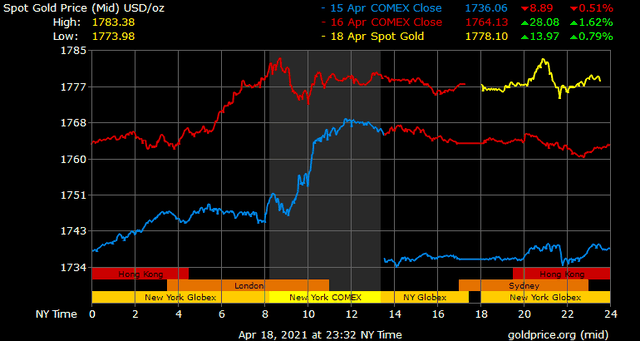 Trên thị trường vàng thế giới, giá vàng giao ngay chốt phiên cuối tuần tại Mỹ tăng 12,9 USD lên 1.776,5 USD/ounce. Sang phiên châu Á sáng nay, giá vàng nhích nhẹ lên gần 1.780 USD/ounce.