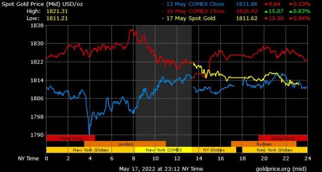 Giá vàng tương lai giao tháng 6/2022 trên sàn Comex New York tăng 4,9 USD lên mức 1.818,9 USD/ounce.