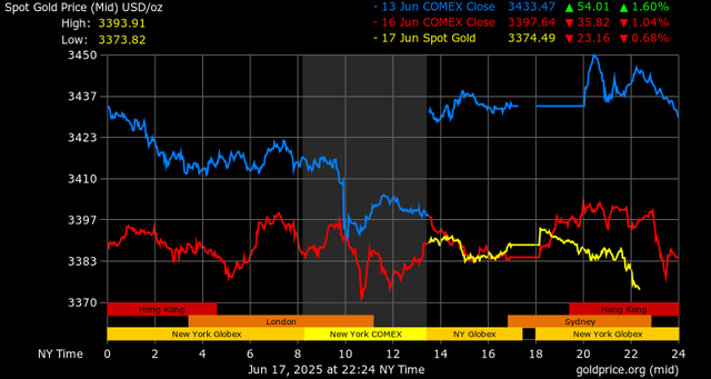 Giá vàng tương lai giao tháng 8/2025 trên sàn Comex New York giảm 10,4 USD, tương ứng giảm 0,3% xuống mức 3.406,9 USD/ounce.