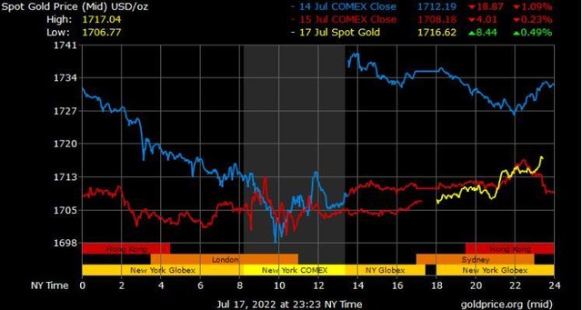 Giá vàng tương lai giao tháng 8/2022 trên sàn Comex New York giảm 2,2 USD xuống 1.703,6 USD/ounce.