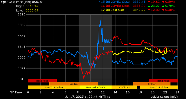 Giá vàng tương lai giao tháng 8/2025 trên sàn Comex New York giảm 13,8 USD, tương ứng giảm 0,41% xuống mức 3.345,3 USD/ounce.