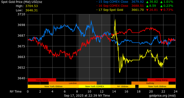Trên thị trường vàng thế giới, giá vàng giao ngay chốt phiên hôm qua tại Mỹ giảm 29,9 USD xuống mức 3.660 USD/ounce. Sang phiên châu Á sáng nay, giá vàng đảo chiều tăng nhẹ 1,8 USD lên 3.661,8 USD/ounce.