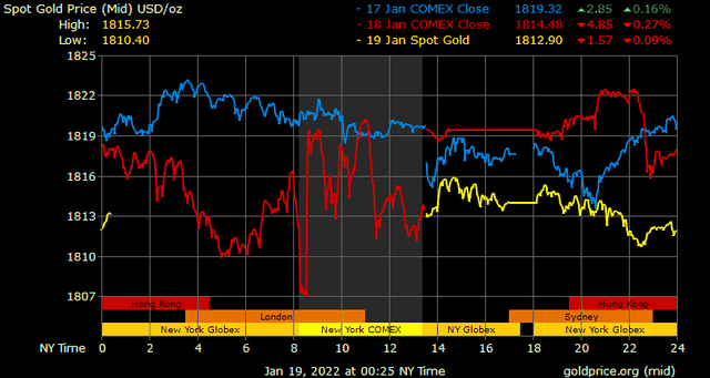 Giá vàng tương lai giao tháng 2/2022 trên sàn Comex New York giảm chưa đến 1 USD xuống 1.811,6 USD/ounce.