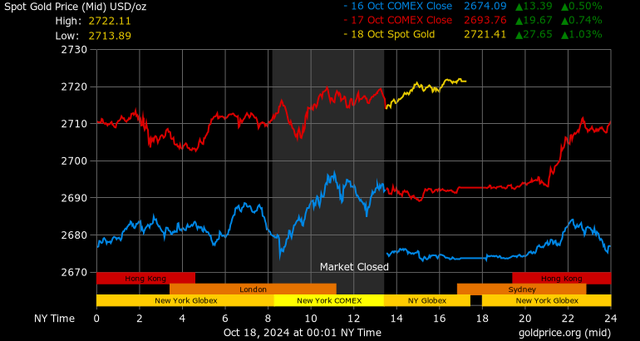 Trên thị trường vàng thế giới, giá vàng giao ngay chốt phiên hôm qua tại Mỹ tăng 28,3 USD lên 2.720,8 USD/ounce.