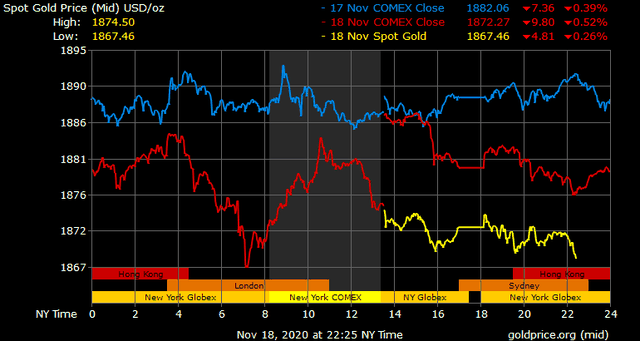Trên thị trường vàng thế giới, giá vàng giao ngay chốt phiên đêm qua tại Mỹ giảm 8,5 USD xuống 1.871,5 USD/ounce. Sang phiên châu Á sáng nay, giá vàng giảm nhẹ xuống gần 1.868 USD/ounce. Giá vàng tương lai giao tháng 12 trên sàn Comex New York giảm 5,4 USD xuống 1.868,5 USD/ounce.