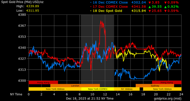 Trên thị trường vàng thế giới, giá vàng giao ngay chốt phiên hôm qua tại Mỹ giảm nhẹ 5,2 USD, tương ứng giảm 0,12% xuống mức 4.332,6 USD/ounce. Sang phiên châu Á sáng nay, giá vàng tiếp tục giảm 16,1 USD xuống 4.316,1 USD/ounce.