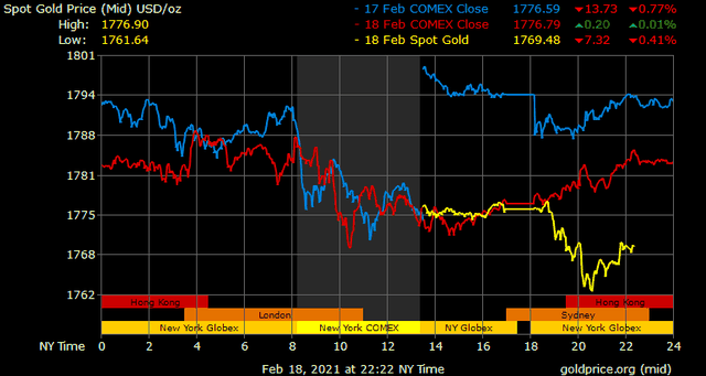 Giá vàng tương lai giao tháng 4 trên sàn Comex New York giảm 7,6 USD xuống 1.767,4 USD/ounce.