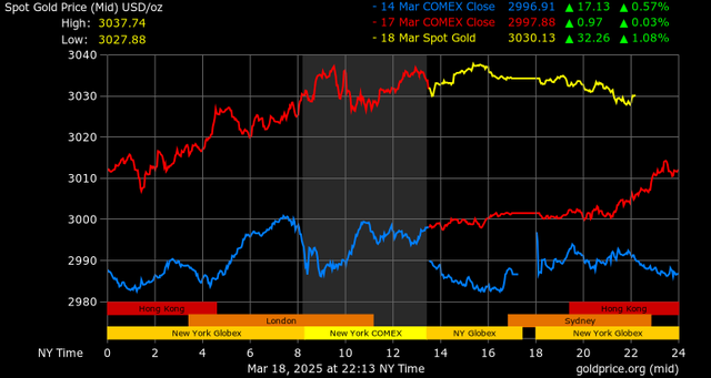 Giá vàng tương lai giao tháng 4/2025 trên sàn Comex New York tăng 34,7 USD, tương ứng tăng 1,15% lên mức 3.040,8 USD/ounce.