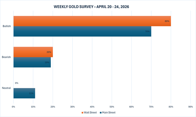 Khảo sát vàng hàng tuần mới nhất của Kitco News cho thấy Phố Wall và Phố Chính đã quay trở lại mạnh mẽ với xu hướng tăng giá sau tuần tăng thứ tư liên tiếp của vàng, cùng với sự lạc quan mới về khả năng tìm ra giải pháp lâu dài cho cuộc chiến tranh Iran.