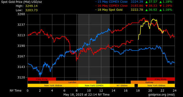Trên thị trường vàng thế giới, giá vàng giao ngay chốt phiên cuối tuần qua tại Mỹ giảm 35,5 USD xuống mức 3.204,5 USD/ounce. Sang phiên châu Á sáng nay, giá vàng đảo chiều tăng 20,3 USD lên 3.224,7 USD/ounce.