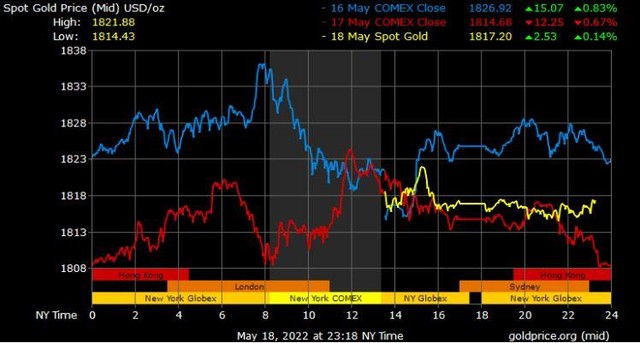 Giá vàng tương lai giao tháng 6/2022 trên sàn Comex New York giảm 3 USD xuống mức 1.815,9 USD/ounce.