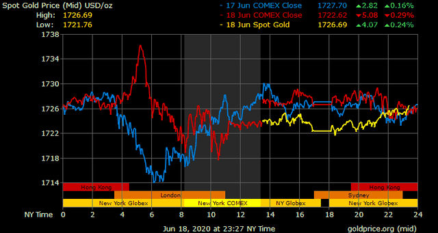 Trên thị trường vàng thế giới, giá vàng giao ngay chốt phiên đêm qua tại Mỹ giảm 3,7 USD xuống 1.722,9 USD/ounce. Sang phiên châu Á sáng nay, giá vàng nhích lên trên 1.727/ounce. Giá vàng tương lai giao tháng 8 trên sàn Comex New York giảm tăng 2,3 USD lên 1.733,9 USD/ounce.