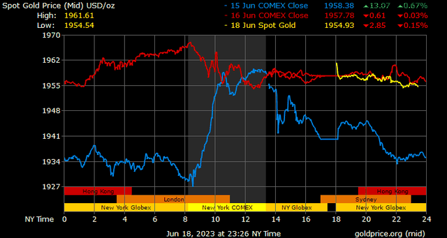 Giá vàng tương lai giao tháng 8/2023 trên sàn Comex New York tăng nhẹ 0,5 USD, tương ứng tăng 0,03% lên 1.971,2 USD/ounce.