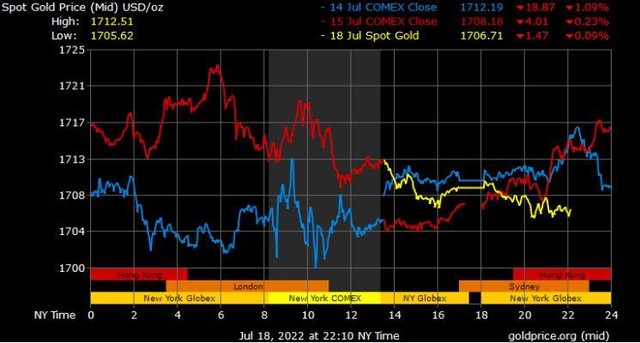 Giá vàng tương lai giao tháng 8/2022 trên sàn Comex New York tăng 6,6 USD lên 1.710,2 USD/ounce.