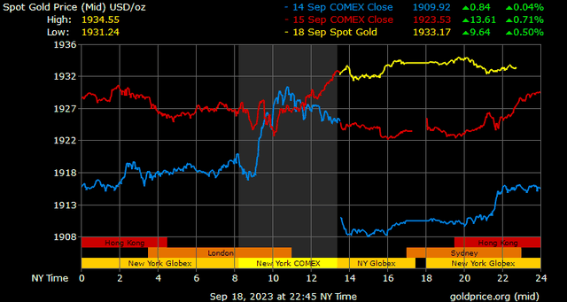 Vàng chỉ tăng nhẹ trong phiên giao dịch giữa ngày thứ Hai của Mỹ. Giao dịch trầm lắng và xu hướng này có thể sẽ tiếp diễn cho đến khi cuộc họp FOMC của Cục Dự trữ Liên bang kết thúc vào chiều thứ Tư ngày 20/9.