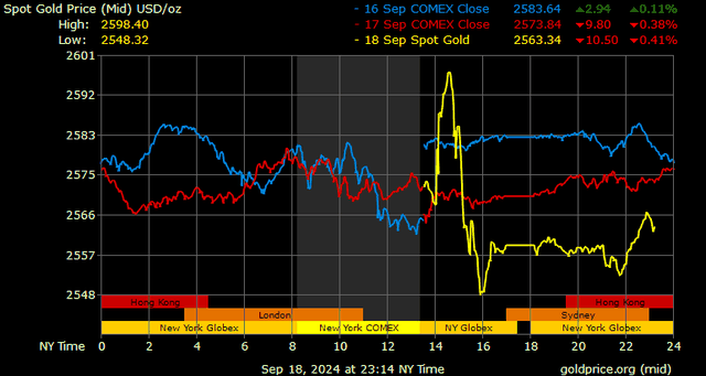 Trên thị trường vàng thế giới, giá vàng giao ngay chốt phiên hôm qua tại Mỹ giảm 10,3 USD xuống 2.559,3 USD/ounce. Sang phiên châu Á sáng nay, giá vàng đảo chiều tăng 4,6 USD lên 2.563,9 USD/ounce.
