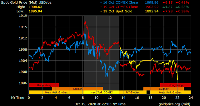 Trên thị trường vàng thế giới, giá vàng giao ngay chốt phiên đêm qua tại Mỹ tăng 3,5 USD lên 1.903,2 USD/ounce. Sang phiên châu Á sáng nay, giá vàng đảo chiều giảm nhanh xuống gần 1.896 USD/ounce. Giá vàng tương lai giao tháng 11 trên sàn Comex New York giảm 8,2 USD xuống 1.899,5 USD/ounce.
