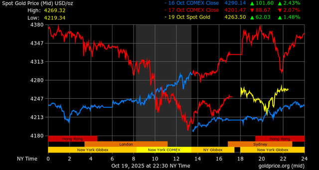 Giá vàng tương lai giao tháng 12/2025 trên sàn Comex New York giảm mạnh 91,3 USD, tương ứng giảm 2,12% xuống mức 4.213,3 USD/ounce.