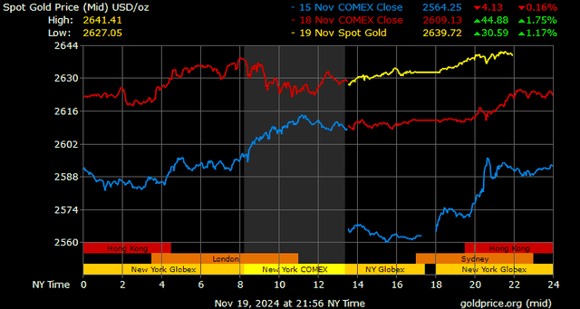 Trên thị trường vàng thế giới, giá vàng giao ngay chốt phiên hôm qua tại Mỹ tăng 20,2 USD lên 2.632,2 USD/ounce. Sang phiên châu Á sáng nay, giá vàng tiếp tục tăng 8 USD lên 2.640,2 USD/ounce.