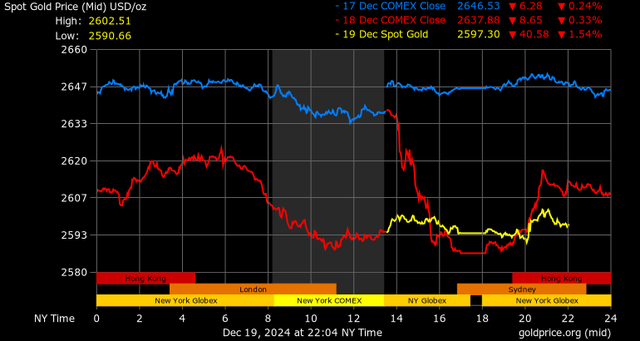 Giá vàng tương lai giao tháng 2/2025 trên sàn Comex New York giảm mạnh 45,2 USD, tương ứng giảm 1,7% xuống mức 2.608,1 USD/ounce.