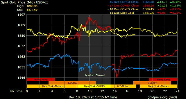 Trên thị trường vàng thế giới, giá vàng giao ngay chốt phiên cuối tuần tại Mỹ giảm 4,9 USD xuống 1.881 USD/ounce. Giá vàng tương lai giao tháng 1/2021 trên sàn Comex New York giảm 3,4 USD xuống 1.884,5 USD/ounce.