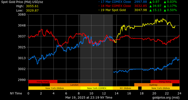 Trên thị trường vàng thế giới, giá vàng giao ngay chốt phiên hôm qua tại Mỹ tăng 13 USD lên mức 3.047,1 USD/ounce. Sang phiên châu Á sáng nay, giá vàng tiếp tục tăng nhẹ 2 USD lên 3.049,1 USD/ounce.