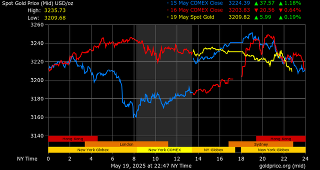 Giá vàng tương lai giao tháng 6/2025 trên sàn Comex New York tăng 46,3 USD, tương ứng tăng 1,45% lên mức 3.233,5 USD/ounce.