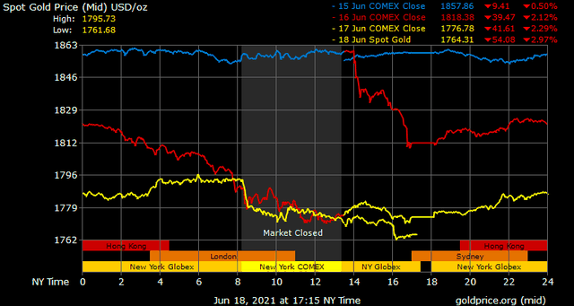 Trong tuần, giá vàng giao ngay đã giảm 114 USD/ounce, tương đương -6,07%. Đây là tuần tồi tệ nhất của giá vàng thế giới kể từ tháng 3/2020.