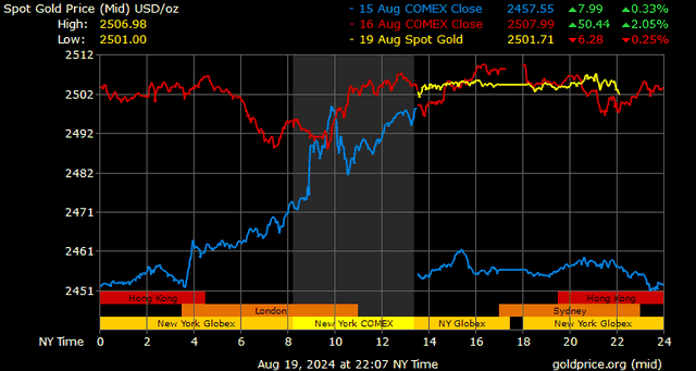 Trên thị trường vàng thế giới, giá vàng giao ngay chốt phiên hôm qua tại Mỹ giảm 3,9 USD xuống 2.504,3 USD/ounce. Sang phiên châu Á sáng nay, giá vàng tiếp tục giảm 4,8 USD xuống 2.499,5 USD/ounce.