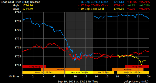 Trên thị trường vàng thế giới, giá vàng giao ngay chốt phiên cuối tuần qua tại Mỹ tăng 0,1 USD lên 1.753,8 USD/ounce. Sang phiên châu Á sáng nay, giá vàng giảm nhanh xuống dưới ngưỡng 1.750 USD/ounce.