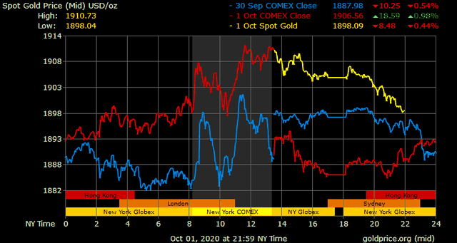 Trên thị trường vàng thế giới, giá vàng giao ngay chốt phiên đêm qua tại Mỹ tăng 21,2 USD lên 1.906,4 USD/ounce. Sang phiên châu Á sáng nay, giá vàng đảo chiều giảm nhanh về gần 1.897 USD/ounce. Giá vàng tương lai giao tháng 11 trên sàn Comex New York giảm 11,2 USD xuống 1.901,1 USD/ounce.