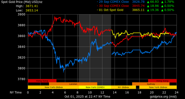 Trên thị trường vàng thế giới, giá vàng giao ngay chốt phiên hôm qua tại Mỹ tăng 7,1 USD, tương ứng tăng 0,18% lên mức 3.865,5 USD/ounce. Sang phiên châu Á sáng nay, giá vàng nhích nhẹ 0,4 USD lên 3.865,9 USD/ounce.