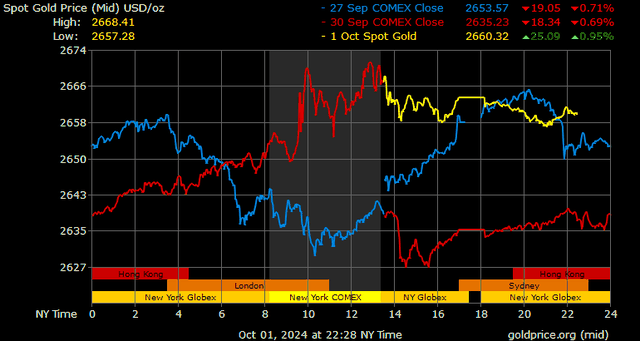 Trên thị trường vàng thế giới, giá vàng giao ngay chốt phiên hôm qua tại Mỹ tăng 28,9 USD lên 2.663,6 USD/ounce. Sang phiên châu Á sáng nay, giá vàng đảo chiều giảm nhẹ 3,5 USD xuống 2.660,1 USD/ounce.