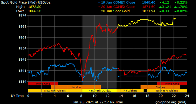 Giá vàng thế giới phiên ngày thứ Tư tăng khá mạnh sau khi ông Joe Biden nhậm chức Tổng thống Mỹ với cam kết chi tiêu lớn để phục hồi nền kinh tế, trong đó, bắt đầu là gói 1.900 tỷ USD. Chi tiêu lớn và chính sách nới lỏng vốn đang thực thi sẽ chắc chắn khiến lạm phát gia tăng và qua đó ủng hộ đà tăng của vàng.