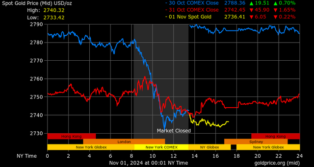 Giá vàng tương lai giao tháng 12/2024 trên sàn Comex New York giảm nhẹ 0,1 USD xuống mức 2.749,2 USD/ounce.