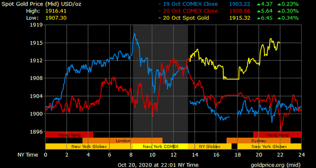 Trên thị trường vàng thế giới, giá vàng giao ngay chốt phiên đêm qua tại Mỹ tăng 2,6 USD lên 1.905,8 USD/ounce. Sang phiên châu Á sáng nay, giá tăng khá mạnh lên trên 1.915 USD/ounce. Giá vàng tương lai giao tháng 11 trên sàn Comex New York tăng 3,6 USD lên 1.915,2 USD/ounce.
