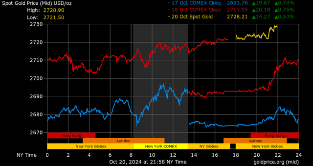 Trên thị trường vàng thế giới, giá vàng giao ngay chốt phiên cuối tuần qua tại Mỹ tăng 28,9 USD lên 2.721,9 USD/ounce. Sang phiên châu Á sáng nay, giá vàng tiếp tục tăng 5,2 USD lên 2.727,1 USD/ounce.
