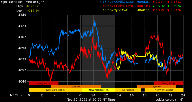 Giá vàng tương lai giao tháng 12/2025 trên sàn Comex New York giảm 22,8 USD, tương ứng giảm 0,56% xuống mức 4.060 USD/ounce.