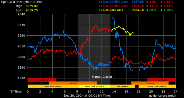 Trên thị trường vàng thế giới, giá vàng giao ngay chốt phiên hôm qua tại Mỹ tăng 29 USD lên 2.623,6 USD/ounce.
