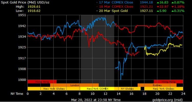 Giá vàng tương lai giao tháng 4/2022 trên sàn Comex New York giảm 13,9 USD xuống 1.929,3 USD/ounce