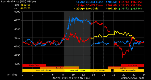 Trên thị trường vàng thế giới, giá vàng giao ngay chốt phiên hôm qua tại Mỹ giảm 11,5 USD, tương ứng giảm 0,24% lên mức 4.831,6 USD/ounce. Sang phiên châu Á sáng nay, giá vàng tiếp tục giảm 11,9 USD xuống mức 4.808,2 USD/ounce.
