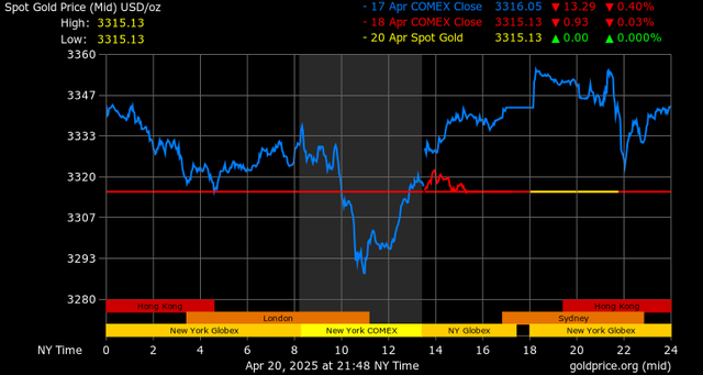 Giá vàng tương lai giao tháng 6/2025 trên sàn Comex New York giảm 18 USD, tương ứng giảm 0,54% xuống mức 3.328,4 USD/ounce.