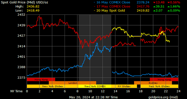 Giá vàng tương lai giao tháng 6/2024 trên sàn Comex New York tăng 21,1 USD, tương ứng tăng 0,87% lên mức 2.438,5 USD/ounce.