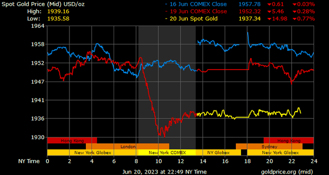 Giá vàng tương lai giao tháng 8/2023 trên sàn Comex New York giảm 23,5 USD, tương ứng giảm 1,19% lên 1.947,7 USD/ounce.