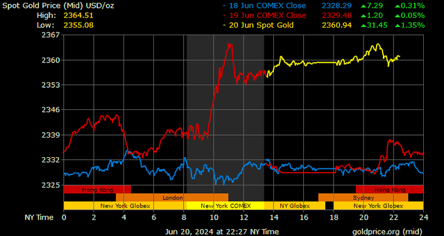 Giá vàng tương lai giao tháng 8/2024 trên sàn Comex New York tăng 22,1 USD, tương ứng tăng 0,94% lên mức 2.369 USD/ounce.