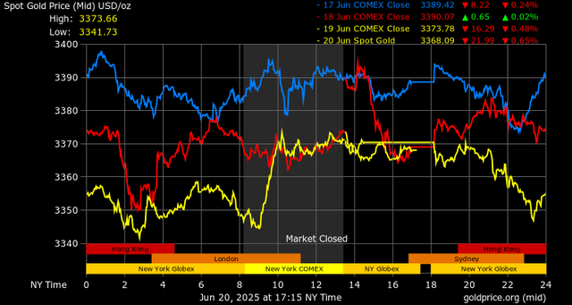Trên thị trường vàng thế giới, giá vàng giao ngay chốt phiên hôm qua tại Mỹ giảm nhẹ 1,6 USD xuống 3.368,8 USD/ounce.